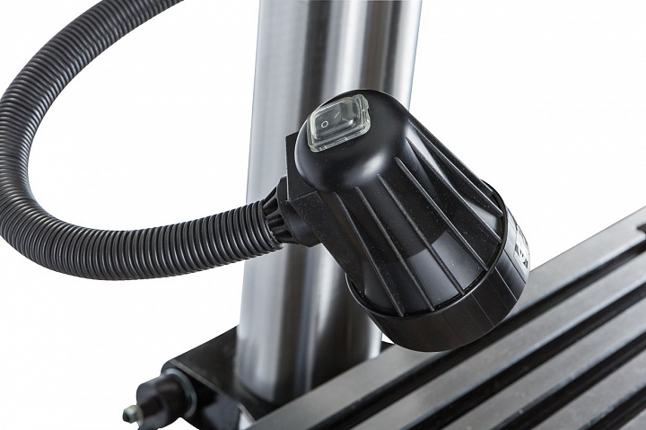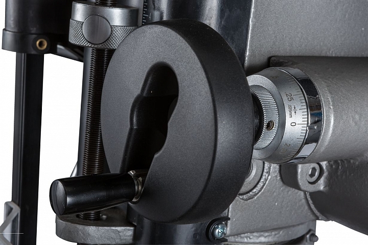 Сверлильно-фрезерный станок выполняет широкий спектр операций. Максимально допустимый диаметр сверления составляет 30 мм. При выполнении фрезерных работ допускается работа концевыми фрезами с максимальным диаметром 20мм и фрезами для торцевого фрезерования с максимальным диаметром 75мм. Модель оснащена шпинделем с конусом МК3, зажимная тяга которого составляет М12. Для повышения жесткости фиксации опора шпинделя оборудована группой конических подшипников. Ход пиноли составляет 125мм. Для повышения качества обработки и повышения производительности работ, на станке установлена функция микроподачи шпинделя. Технологический процесс контролируется механической регулировкой вылета шпинделя.